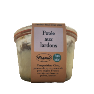 Plat cuisiné par L’Atelier Fermier de Naves. Les lardons grillées agrémentent une potée avec chou, carotte et pomme de terre. Un plat de saison complet.